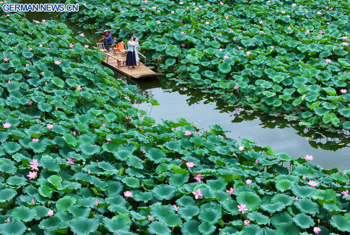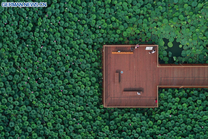 BEIJING, 6. August 2025 (Xinhua) -- Die Luftaufnahme einer Drohne zeigt Menschen beim Betrachten von Lotosblumen am Xuanwu-See in Nanjing in der Provinz Jiangsu in Ostchina, 10. Juli 2025. (Foto von Xin Yi/Xinhua)