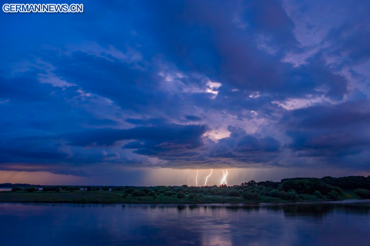 BEIJING, 6. August 2025 (Xinhua) -- Das Foto zeigt Kumuluswolken und Blitze über dem Kreis Jiayin der Stadt Yichun in der Provinz Heilongjiang im Nordosten Chinas, 21. Juli 2025. (Foto von Li Shaojun/Xinhua)