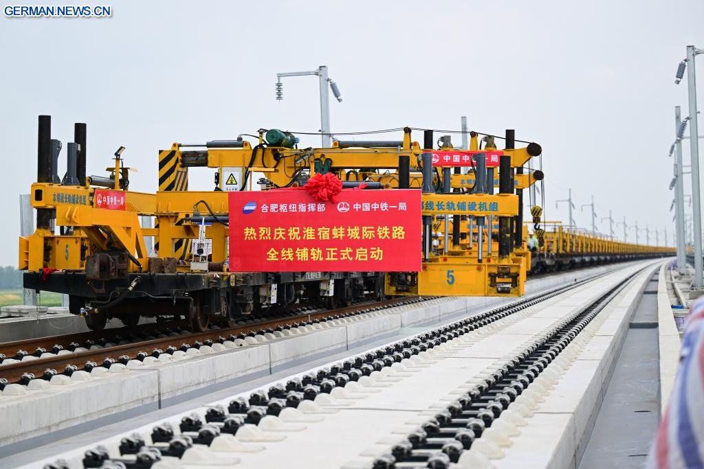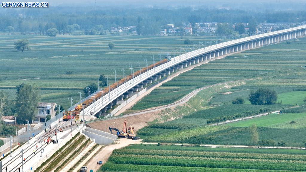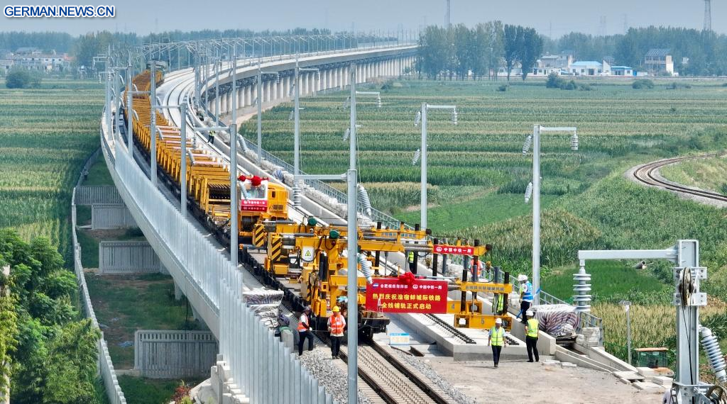 HEFEI, 6. August 2025 (Xinhuanet) -- Das am 6. August 2025 aufgenommene Foto zeigt die Gleisbaustelle einer Intercity-Bahnstrecke in der ostchinesischen Provinz Anhui. Der erste Abschnitt der Strecke, Teil der Intercity-Bahnverbindung zwischen Huaibei, Suzhou und Bengbu in der Provinz Anhui, wurde am Mittwoch mit den Gleisbauarbeiten begonnen. (Quelle: Xinhua/Zhou Mu)