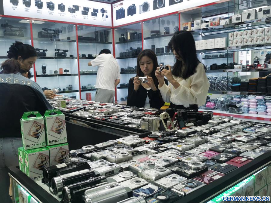 Das mit einem Mobiltelefon aufgenommene Foto zeigt Kunden beim Aussuchen von CCD-Kameras in einem Geschäft im berühmten Elektronikzentrum Huaqiangbei in Shenzhen in der Provinz Guangdong in Südchina, 5. November 2024. (Xinhua/Wang Feng)