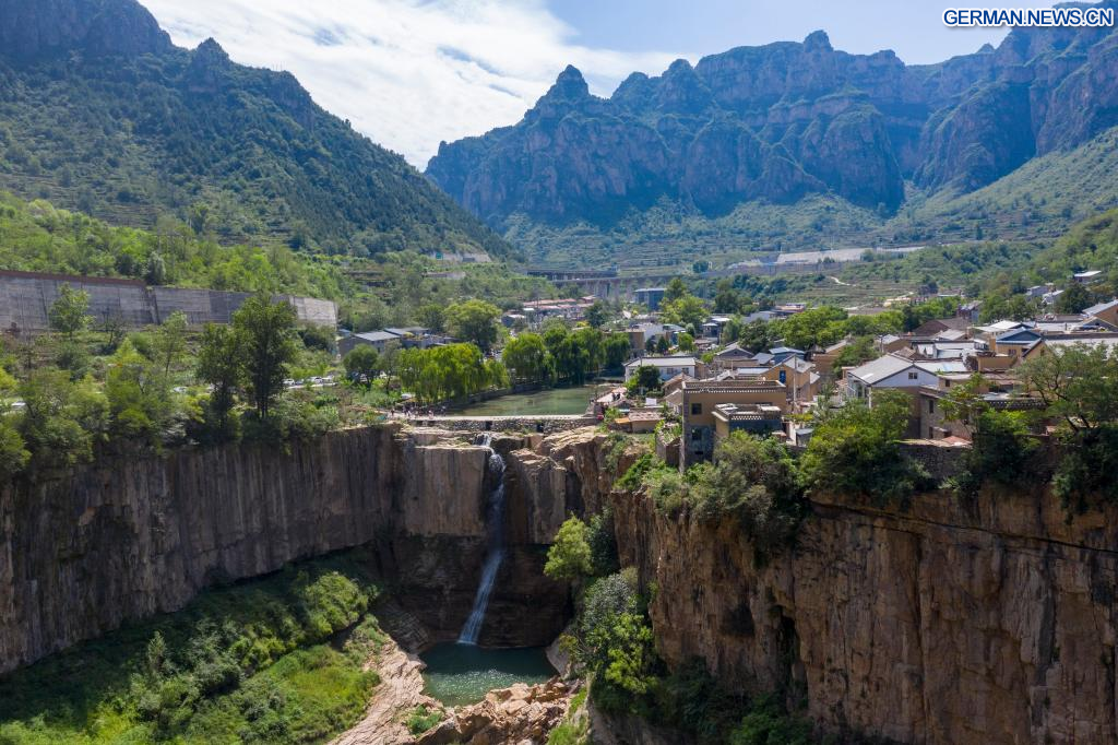 PINGSHUN, 7. August 2025 (Xinhuanet) -- Das am 6. August 2025 aufgenommene Luftbild einer Drohne zeigt eine Ansicht des Dorfes Hongni im Kreis Pingshun in der nordchinesischen Provinz Shanxi. Das Dorf Hongni ist in seine touristische Hochsaison eingetreten. Das tief in den Taihang-Bergen gelegene Dorf blickt auf eine lange Geschichte zurück und ist als „antikes Dorf auf der Klippe“ bekannt.