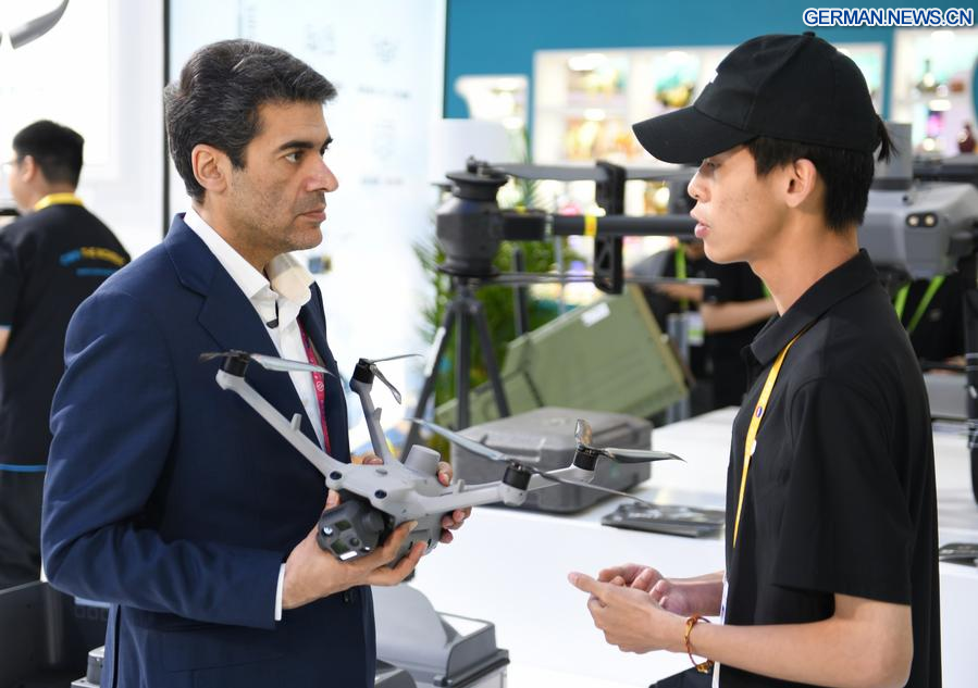 Ein Mitarbeiter präsentiert einem Besucher ein Produkt am Stand von DJI auf der 5. China International Consumer Products Expo (CICPE) in Haikou in der Provinz Hainan in Südchina, 15. April 2025. (Xinhua/Sun Xiaotian)