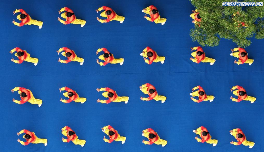 BEIJING, 8. August 2025 (Xinhuanet) -- Die Luftaufnahme einer Drohne vom 8. August 2025 zeigt Menschen, die in einem Park in der Stadt Yangzhou in der ostchinesischen Provinz Jiangsu Tai Chi üben. (Foto von Meng Delong/Xinhua)