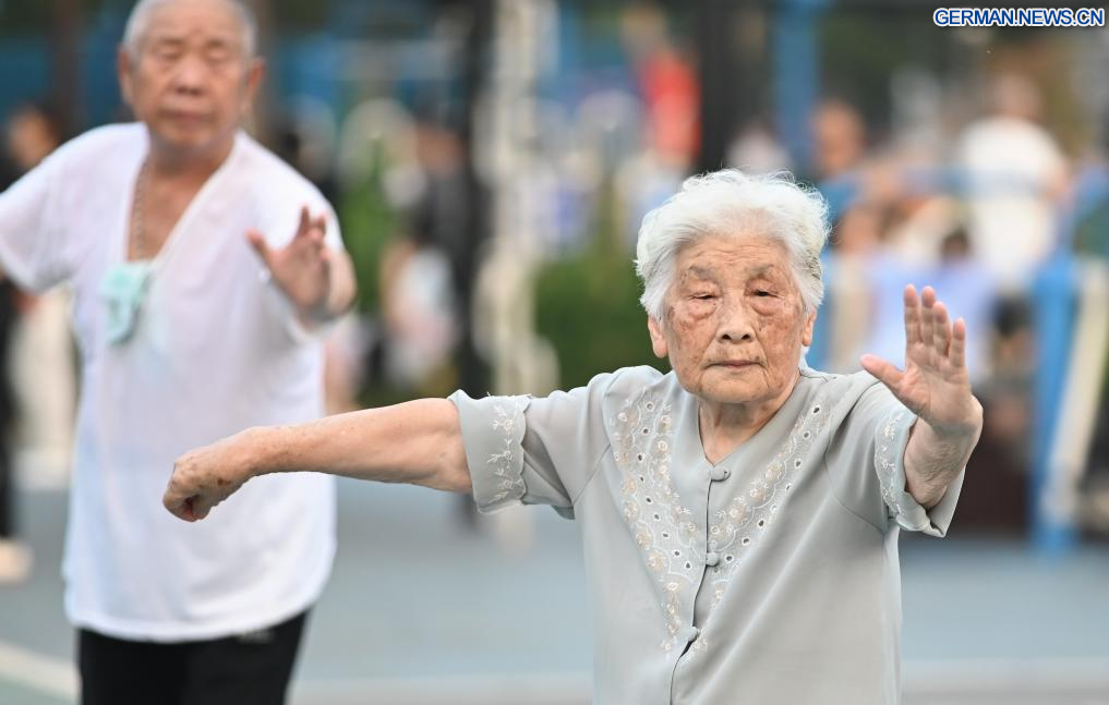 BEIJING, 8. August 2025 (Xinhuanet) -- Senioren üben Tai Chi in einem Park in der Stadt Tengzhou in der ostchinesischen Provinz Shandong, 8. August 2025. (Foto von Li Zhijun/Xinhua)