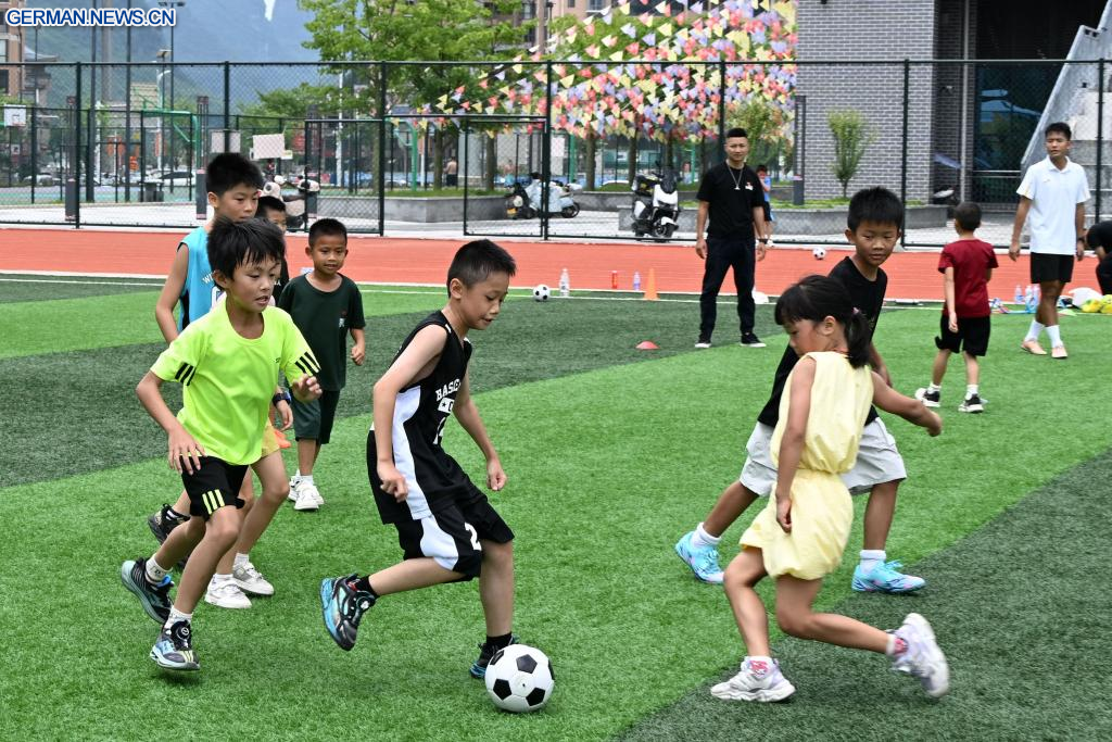 BEIJING, 10. August 2025 (Xinhuanet) -- Kinder spielen Fußball in der Stadt Hechi im südchinesischen Autonomen Gebiet Guangxi der Zhuang, 10. August 2025. (Foto von Wei Rudai/Xinhua)