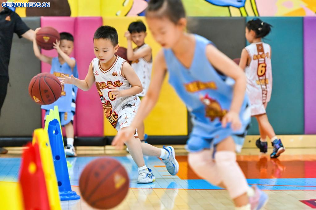 BEIJING, 10. August 2025 (Xinhuanet) -- Kinder spielen Basketball in einem Trainingszentrum in Tianjin in Nordchina, 10. August 2025. (Foto von Du Penghui/Xinhua)
