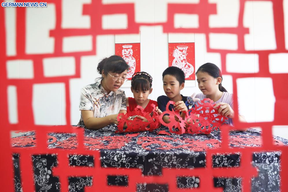 BEIJING, 10. August 2025 (Xinhuanet) -- Kinder lernen das Papierschneiden in einem lokalen Wohngebiet im Bezirk Fengrun in der Stadt Tangshan in der nordchinesischen Provinz Hebei, 9. August 2025. (Foto von Zhu Dayong/Xinhua)