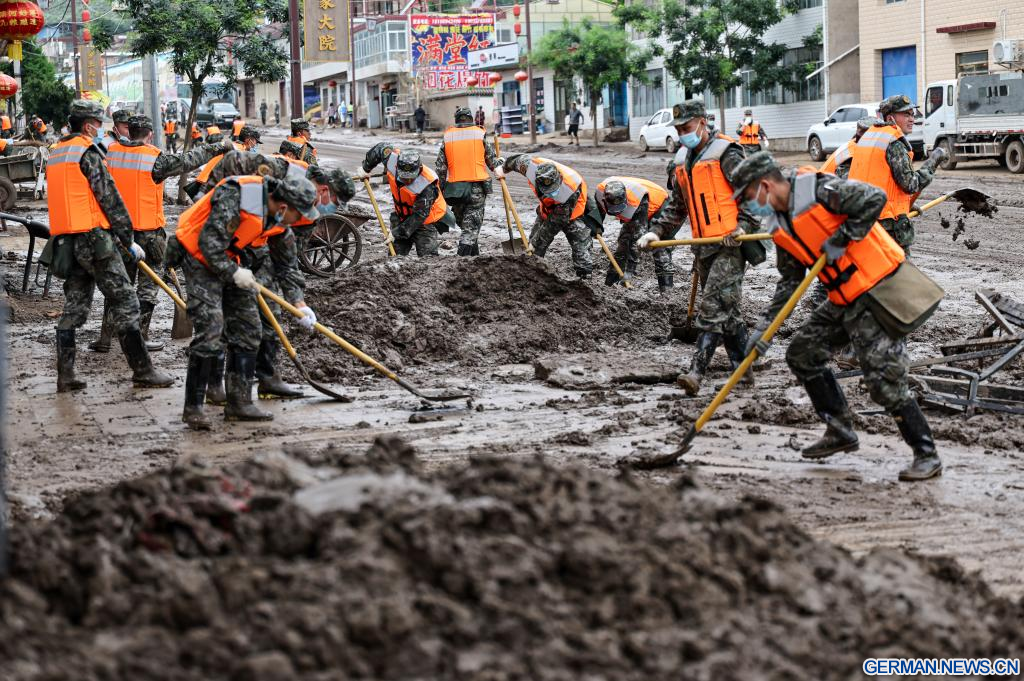 YUZHONG, 10. August 2025 (Xinhuanet) -- Angehörige des Gansu-Korps der Volksbewaffneten Polizei beseitigen Schlamm im Dorf Xinglongshan im Kreis Yuzhong in der nordwestchinesischen Provinz Gansu, 10. August 2025. Das Gansu-Korps der Volksbewaffneten Polizei mobilisierte am Sonntag über 400 Offiziere und Soldaten und entsandte sie in mehrere Dörfer im Kreis Yuzhong, darunter Xinglongshan, Maliantan, Xiaokangying und Jiuzhuanggou. Die Streitkräfte werden Katastrophenhilfearbeiten durchführen, darunter die Suche nach Vermissten, die Räumung von Straßen, den Transport von Materialien und die Desinfektion der betroffenen Gebiete. (Foto von Hou Conghui/Xinhua)