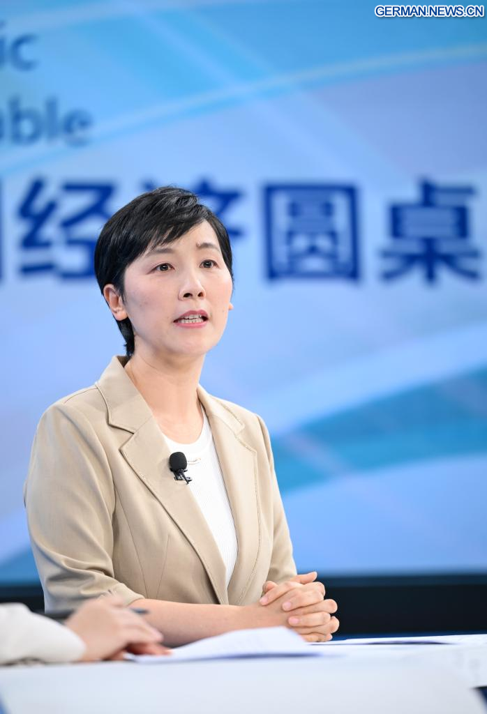BEIJING, 8. August 2025 (Xinhuanet) -- Cai Ping, Beamtin bei der Staatlichen Kommission für Entwicklung und Reform (NDRC), spricht am Drehort der neuesten Folge von China Economic Roundtable, einer von der Nachrichtenagentur Xinhua veranstalteten medienübergreifenden Talkshow. (Quelle: Xinhua/Chen Yehua)