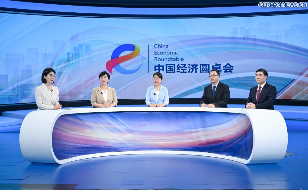 BEIJING, 8. August 2025 (Xinhuanet) -- Teilnehmer nehmen an der neuesten Folge von China Economic Roundtable, einer von der Nachrichtenagentur Xinhua veranstalteten medienübergreifenden Talkshow, teil. (Quelle: Xinhua/Chen Yehua)