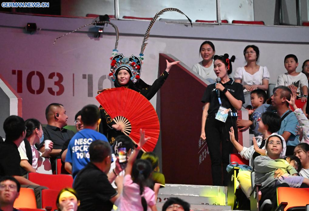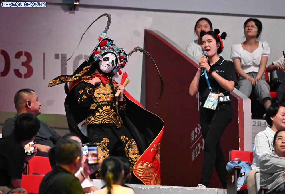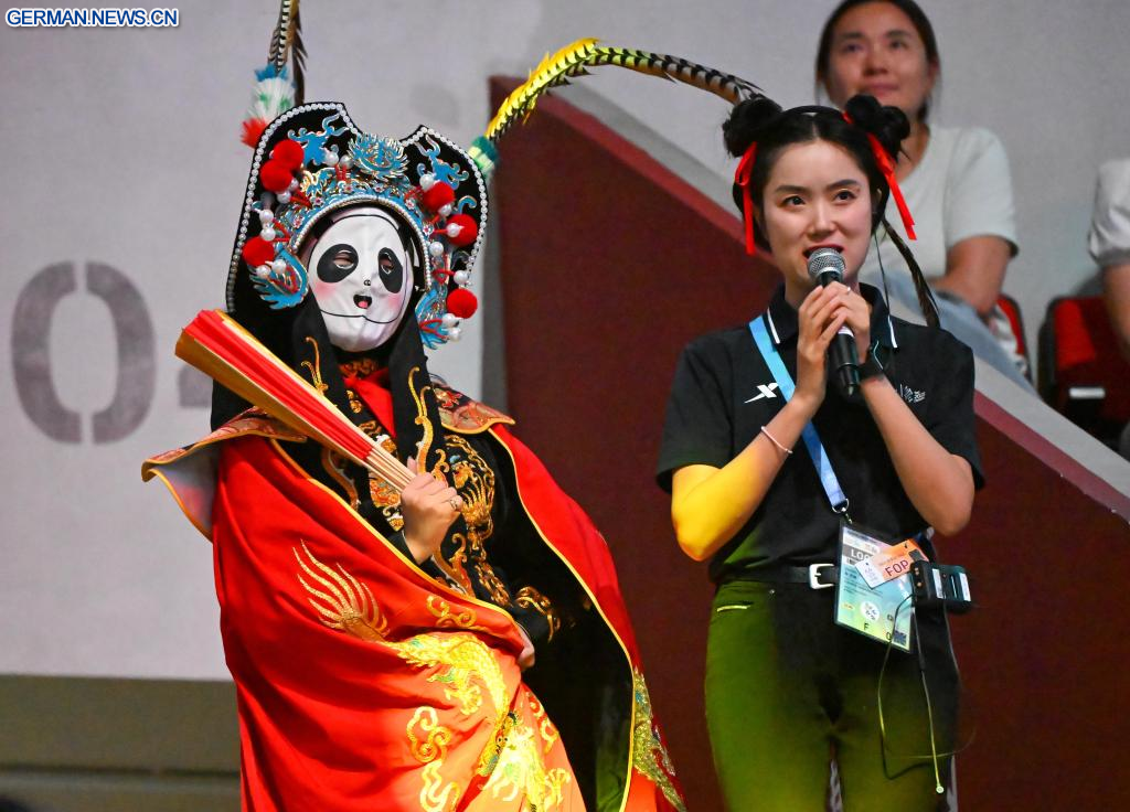 CHENGDU, 10. August 2025 (Xinhuanet) -- Ein Künstler führt für die Zuschauer „Bian Lian“, oder Gesichtswechsel, vor dem Finale der Männergruppe im Akrobatik-Turnen bei den World Games 2025 in Chengdu in der südwestchinesischen Provinz Sichuan vor, 10. August 2025. (Quelle: Xinhua/Sun Fanyue)
