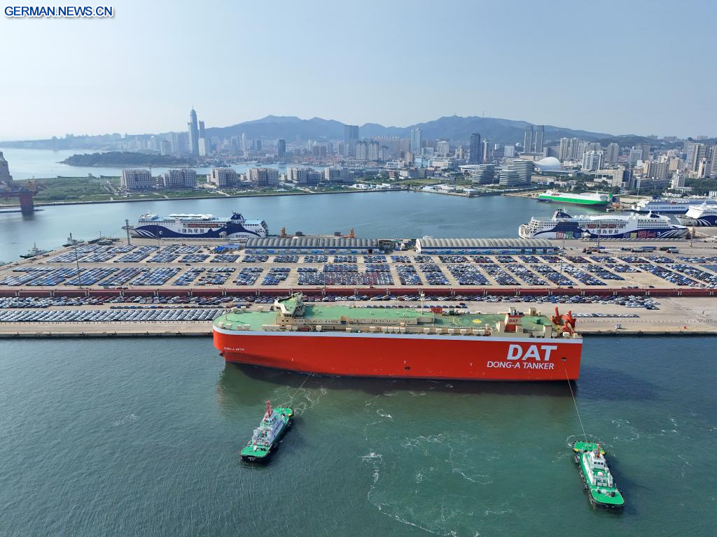 BEIJING, 12. August 2025 (Xinhuanet) -- Das am 5. August 2025 aufgenommene Drohnenfoto zeigt eine mit Autos für den Export beladene Frachtfähre, die den Hafen von Yantai in der ostchinesischen Provinz Shandong verlässt. Chinas Autoindustrie verzeichnete im Juli laut am Montag veröffentlichten Branchendaten sowohl bei der Produktion als auch beim Absatz ein solides Wachstum gegenüber dem Vorjahr.
