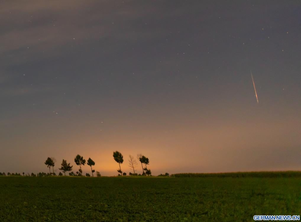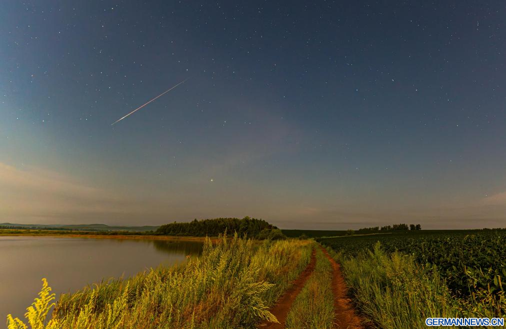 HARBIN, 13. August 2025 (Xinhuanet) -- Das am 13. August 2025 aufgenommene Foto zeigt den Perseiden-Meteorschauer über dem Kreis Tangyuan der Stadt Jiamusi in der nordostchinesischen Provinz Heilongjiang. Der jährliche Perseiden-Meteorschauer erreichte am Mittwoch seinen Höhepunkt. (Foto von Zhu Zongqiang/Xinhua)