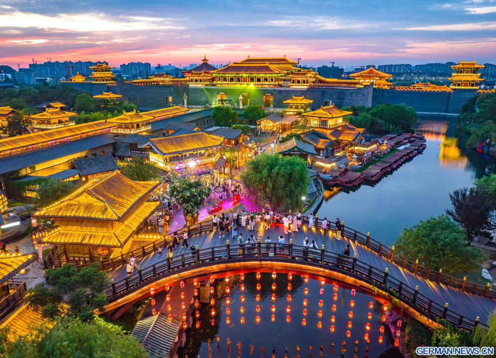 BEIJING, 13. August 2025 (Xinhuanet) -- Die Luftaufnahme einer Drohne vom 13. August 2025 zeigt einen Blick auf ein Landschaftsgebiet mit einem Lotusteich in der Stadt Xinghua in der ostchinesischen Provinz Jiangsu. Menschen genießen ihre Sommerzeit, indem sie durch das Land reisen. (Foto von Zhou Shegen/Xinhua)