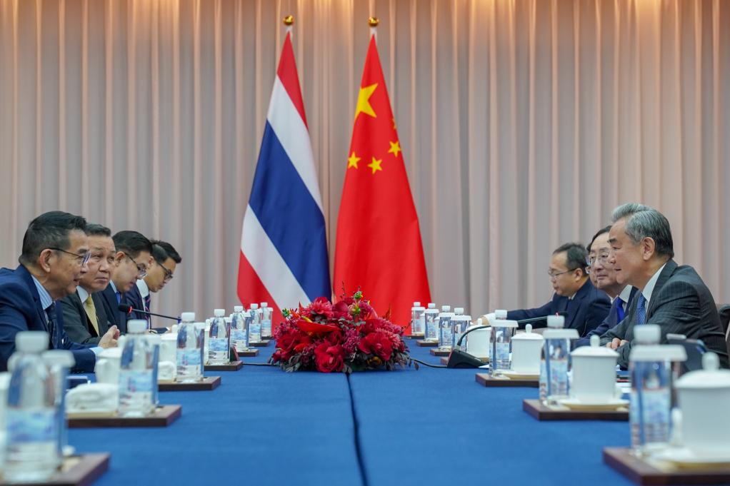 KUNMING, 14. August 2025 (Xinhuanet) -- Der chinesische Außenminister Wang Yi, ebenfalls Mitglied des Politbüros des Zentralkomitees der Kommunistischen Partei Chinas, trifft sich in Anning in der südwestchinesischen Provinz Yunnan mit dem thailändischen Außenminister Maris Sangiampongsa, der sich anlässlich des zehnten Außenministertreffens der Lancang-Mekong-Kooperation (LMC) in China aufhält, 14. August 2025. (Quelle: Xinhua/Peng Yikai)