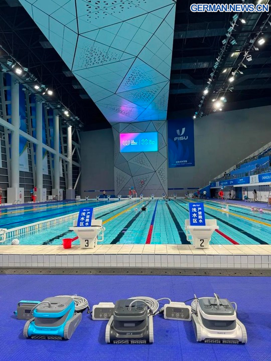 CHENGDU, 14. August (Xinhua) -- Reinigungsroboter kontrollieren Schwimmbecken, AR-Brillen überwinden Sprachbarrieren und Sprühnebelanlagen bekämpfen die Sommerhitze, während modernste Technologie den Betrieb und das Leben der Athleten bei den World Games in Chengdu verändert.