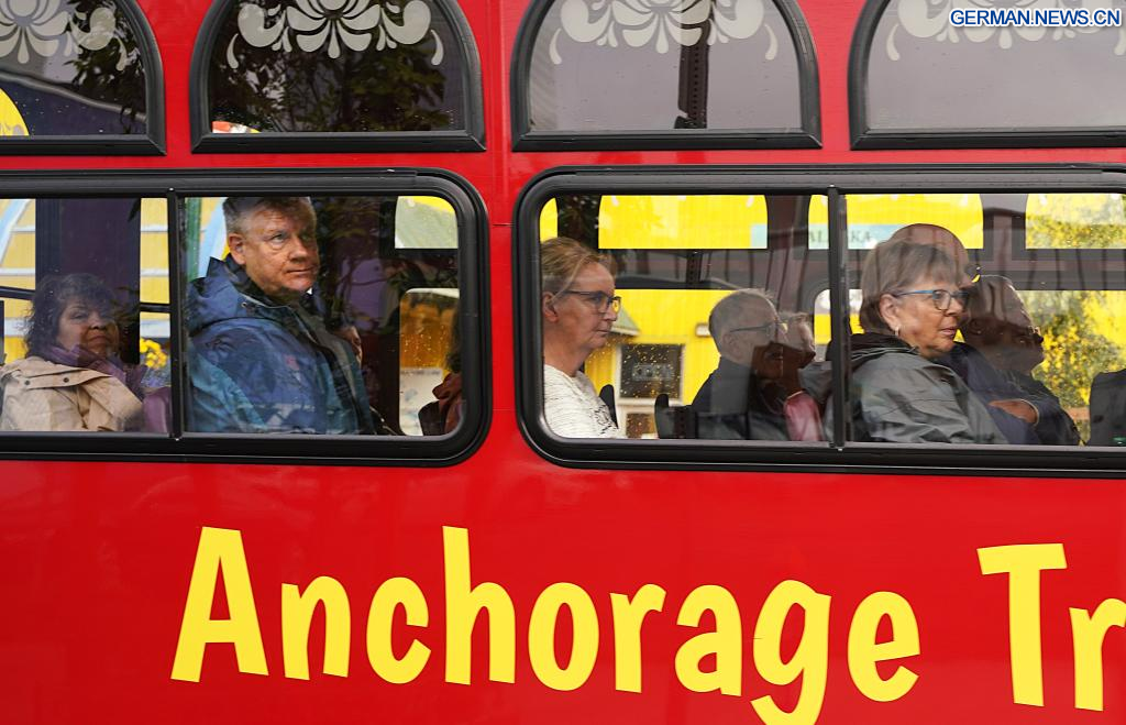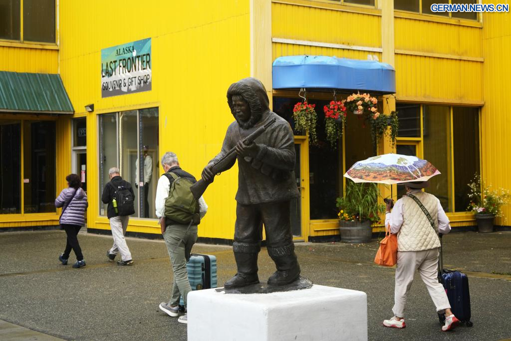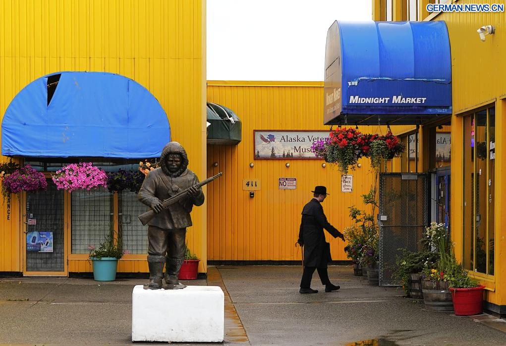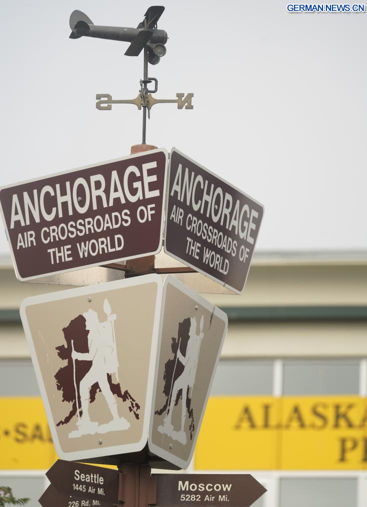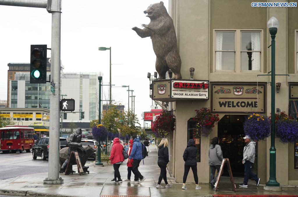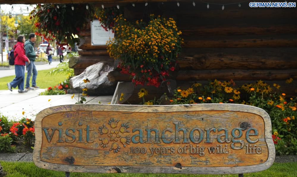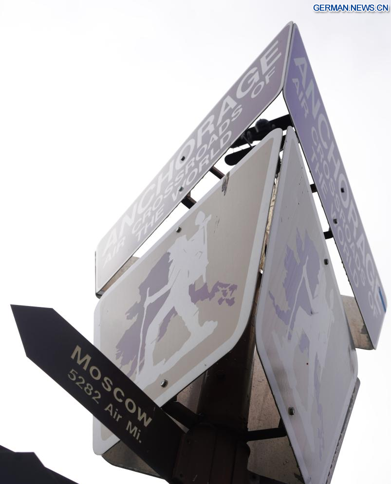 ANCHORAGE (USA), 14. August 2025 (Xinhuanet) -- Das am 14. August 2025 aufgenommene Foto zeigt Schilder in Anchorage, Alaska, den Vereinigten Staaten. Das Einzelgespräch zwischen dem russischen Präsidenten Wladimir Putin und dem US-Präsidenten Donald Trump ist für Freitag in Anchorage geplant. (Quelle: Xinhua/Wu Xiaoling)