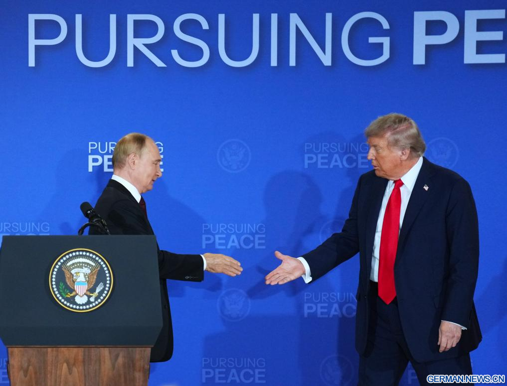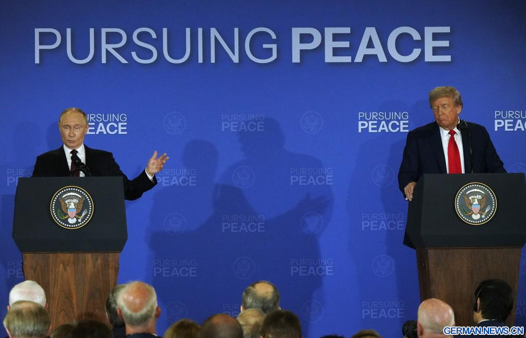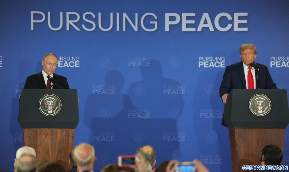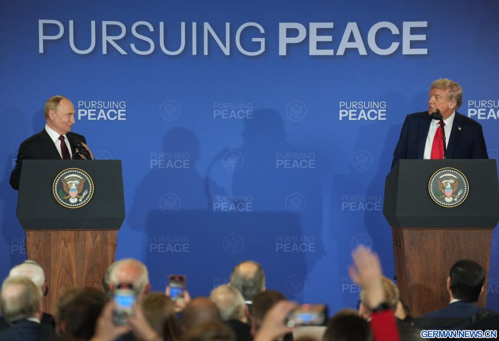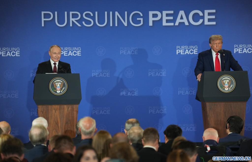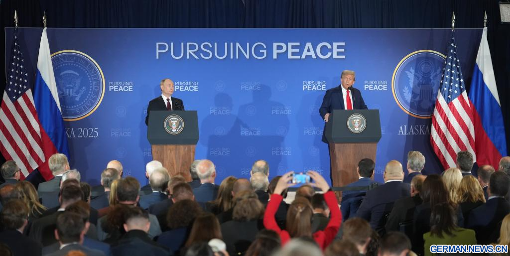 ANCHORAGE, Vereinigte Staaten, 15. August 2025 (Xinhuanet) -- US-Präsident Donald Trump und der russische Präsident Wladimir Putin traten am Freitag nach Abschluss ihrer Gespräche in Anchorage im US-Bundesstaat Alaska zu einer gemeinsamen Pressekonferenz auf.