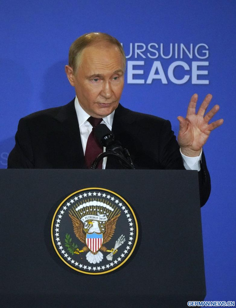 ANCHORAGE (USA), 15. August 2025 (Xinhuanet) -- Der russische Präsident Wladimir Putin hält Rede auf einer gemeinsamen Pressekonferenz mit US-Präsident Donald Trump (nicht im Bild) nach Abschluss ihrer Gespräche in Anchorage, Alaska, den Vereinigten Staaten, 15. August 2025. Die Gespräche, die auf Joint Base Elmendorf-Richardson in der Stadt Anchorage stattfanden, dauerten etwa drei Stunden. (Quelle: Xinhua/Wu Xiaoling)