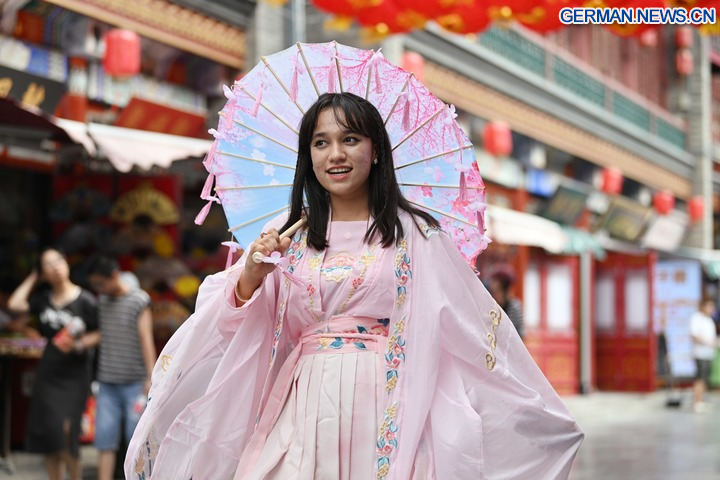 TIANJIN, 18. August 2025 (Xinhua) -- Eine junge Studentin aus einem Land der Shanghaier Organisation für Zusammenarbeit (SOZ) posiert für ein Foto in traditioneller chinesischer Kleidung in einer historischen Kulturstraße in Tianjin in Nordchina, 14. August 2025. Hunderte junge Studenten aus SOZ-Ländern, die im Rahmen eines Kulturaustauschprogramms China besuchen, erlebten am Donnerstag in Tianjin den Charme der traditionellen chinesischen Kultur. (Xinhua/Li Ran)