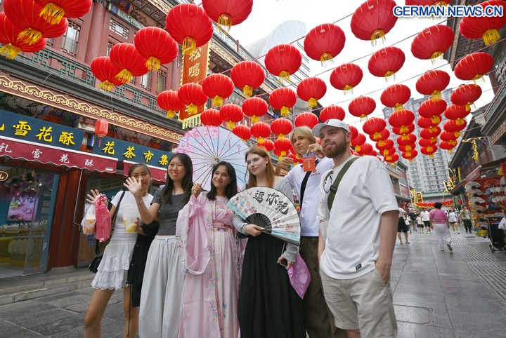 TIANJIN, 18. August 2025 (Xinhua) -- Junge Studenten aus Ländern der Shanghaier Organisation für Zusammenarbeit (SOZ) besuchen eine historische Kulturstraße in Tianjin in Nordchina, 14. August 2025. Hunderte junge Studenten aus SOZ-Ländern, die im Rahmen eines Kulturaustauschprogramms China besuchen, erlebten am Donnerstag in Tianjin den Charme der traditionellen chinesischen Kultur. (Xinhua/Li Ran)