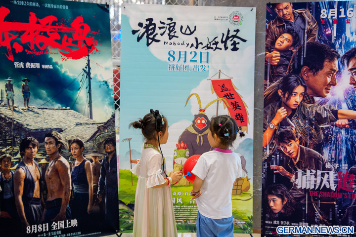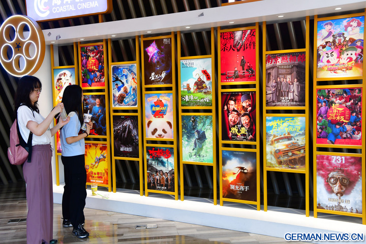 NANJING, 18. August 2025 (Xinhua) -- Kinder betrachten Filmplakate in einem Kino in Nanjing in der Provinz Jiangsu in Ostchina, 17. August 2025. Der Filmmarkt verzeichnete an diesem Wochenende einen großen Aufschwung. Während der Sommerferien laufen zahlreiche beliebte Filme in den Kinos. (Foto von Du Yi/Xinhua)