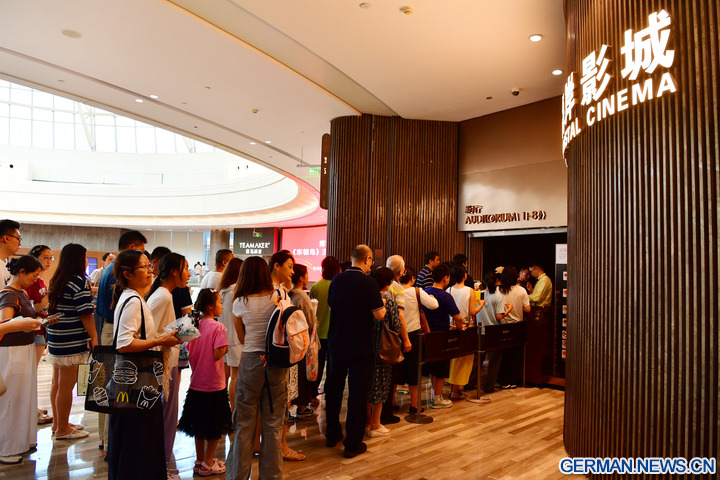 NANJING, 18. August 2025 (Xinhua) -- Das Foto zeigt eine Schlange von Zuschauern in einem Kino in Wuxi in der Provinz Jiangsu in Ostchina, 17. August 2025. Der Filmmarkt verzeichnete an diesem Wochenende einen großen Aufschwung. Während der Sommerferien laufen zahlreiche beliebte Filme in den Kinos. (Foto von Huan Yueliang/Xinhua)