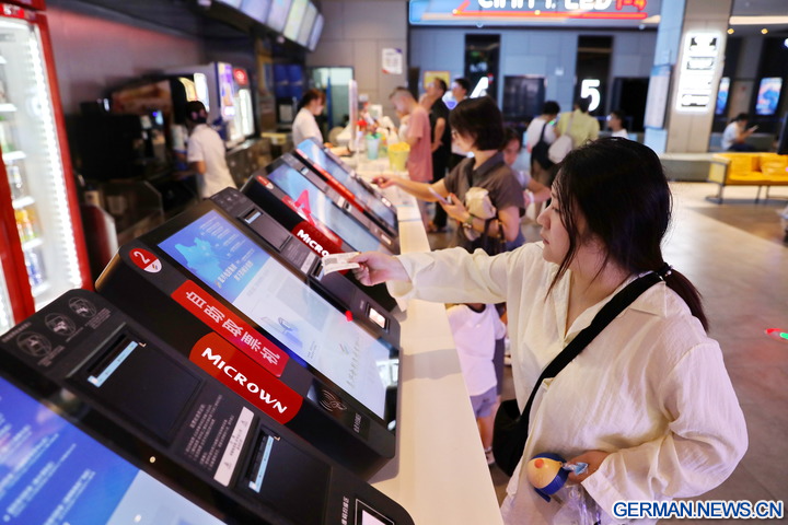 NANJING, 18. August 2025 (Xinhua) -- Zuschauer holen ihre Kinokarten in einem Kino in Jiaxing in der Provinz Zhejiang in Ostchina, 17. August 2025. Der Filmmarkt verzeichnete an diesem Wochenende einen großen Aufschwung. Während der Sommerferien laufen zahlreiche beliebte Filme in den Kinos. (Foto von Jin Peng/Xinhua)