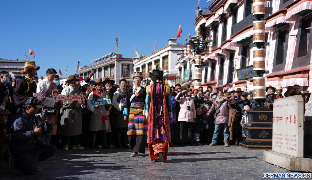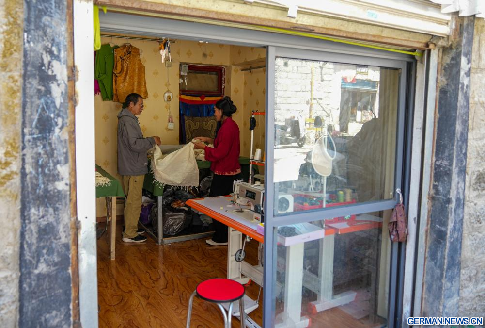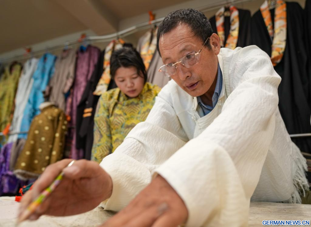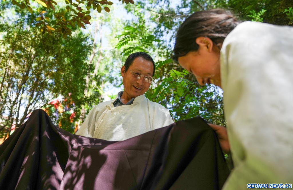 Als Erbe der tibetischen Kleiderherstellungstechnik, einem regionalen immateriellen Kulturerbe, widmet sich Losang Monlam seit über vier Jahrzehnten der Weitergabe dieses Handwerks. Der 60-Jährige hat mehr als hundert Lehrlinge ausgebildet und sich mit der Erstellung von Lehrbüchern und dem Aufbau einer Datenbank über tibetische Kleidung beschäftigt. (Quelle: Xinhua/Jigme Dorje)