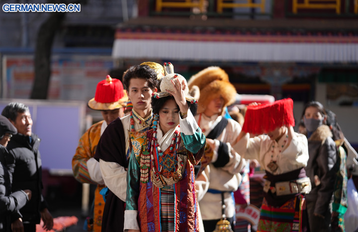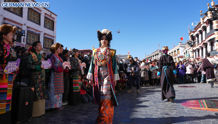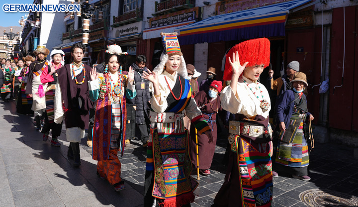 LHASA, 19. August 2025 (Xinhua) -- Das Foto zeigt Models beim Präsentieren von traditionellen tibetischen Trachten während einer Neujahrsmodenschau in Lhasa im Autonomen Gebiet Xizang im Südwesten Chinas, 3. Januar 2025. Traditionelle tibetische Trachten haben nach Jahrhunderten der Entwicklung und Weiterentwicklung reichhaltige Stile und einzigartige Merkmale ausgebildet.