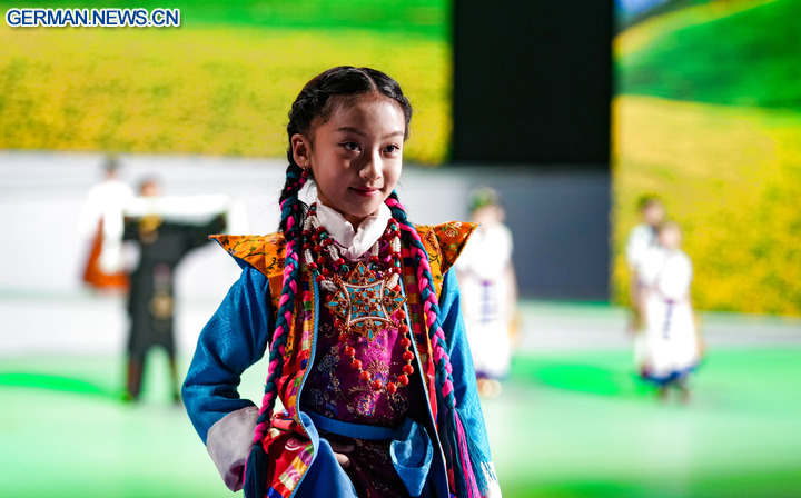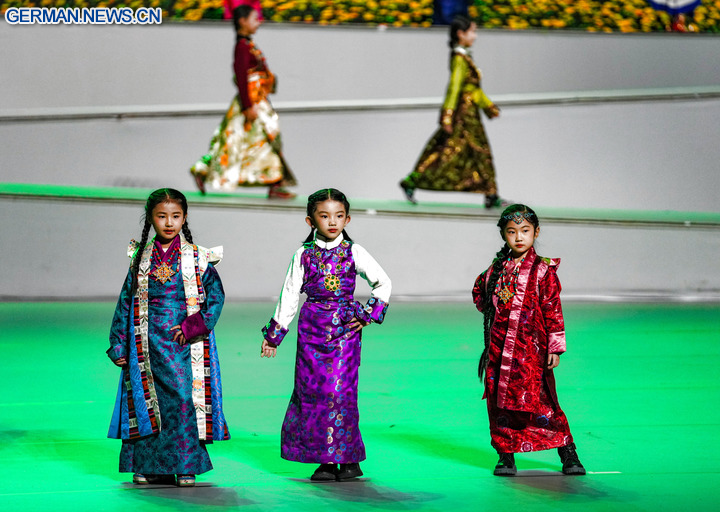 LHASA, 19. August 2025 (Xinhua) -- Das Foto zeigt ein Kinder-Model beim Präsentieren einer traditionellen tibetischen Tracht während einer Modewoche in Lhasa im Autonomen Gebiet Xizang im Südwesten Chinas, 5. Januar 2025. Traditionelle tibetische Trachten haben nach Jahrhunderten der Entwicklung und Weiterentwicklung reichhaltige Stile und einzigartige Merkmale ausgebildet.