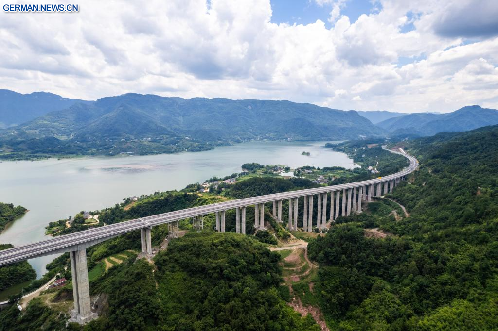 CHANGSHA, 19. August 2025 (Xinhuanet) -- Die Luftaufnahme einer Drohne zeigt eine Autobahnkreuzung auf der Luci-Schnellstraße in der zentralchinesischen Provinz Hunan, 19. August 2025. Die Luci-Schnellstraße befindet sich in der letzten Phase der integrierten Systemtests. Die 79 Kilometer lange vierspurige Schnellstraße wird als wichtiger Tourismuskorridor dienen und wichtige Sehenswürdigkeiten von den Drei Schluchten des Jangtse bis zum Nationalen Naturreservat Huping-Berg und dem Nationalen Waldpark Zhangjiajie verbinden. (Quelle: Xinhua/Chen Sihan)
