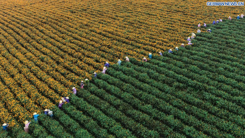 BEIJING, 23. August 2025 (Xinhuanet) -- Das am 23. August 2025 aufgenommene Luftbild einer Drohne zeigt Bauern bei der Ernte von Ringelblumen in Tengchong in der südwestchinesischen Provinz Yunnan. Chushu der Jahresabschnitte fällt auf den Samstag. Landwirte im ganzen Land sind mit der Arbeit auf den Feldern beschäftigt. (Foto von Gong Zujin/Xinhua)