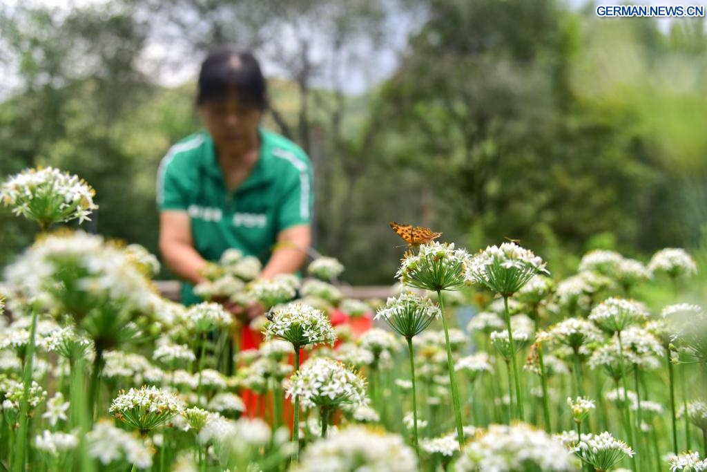 BEIJING, 23. August 2025 (Xinhuanet) -- Eine Dorfbewohnerin pflückt Schnittlauchblüten auf einem Feld in der Stadt Qingzhou in der ostchinesischen Provinz Shandong, 23. August 2025. Chushu der Jahresabschnitte fällt auf den Samstag. Landwirte im ganzen Land sind mit der Arbeit auf den Feldern beschäftigt. (Foto von Wang Jilin/Xinhua)