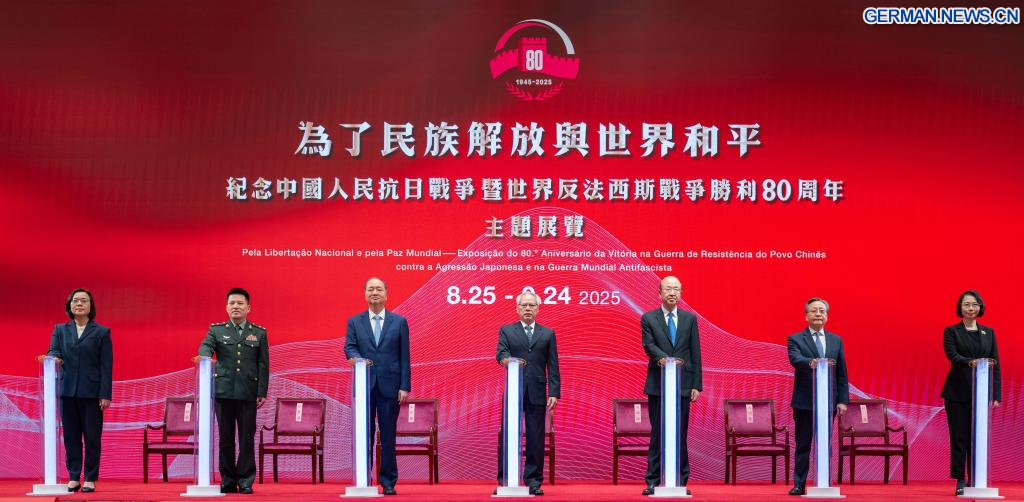MACAU, 25. August 2025 (Xinhuanet) -- Gäste nehmen an der Eröffnungszeremonie der Ausstellung zum Gedenken an den 80. Jahrestag des Sieges im Widerstandskrieg des chinesischen Volkes gegen die japanische Aggression und im weltweiten antifaschistischen Krieg in Macao in Südchina teil, 25. August 2025. Die Ausstellung wurde am Montag in der Sonderverwaltungszone (SAR) Macau in China eröffnet, an der etwa 280 Regierungsbeamte und Vertreter aus verschiedenen Gesellschaftssektoren teilnahmen.