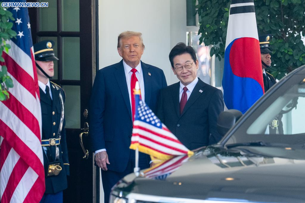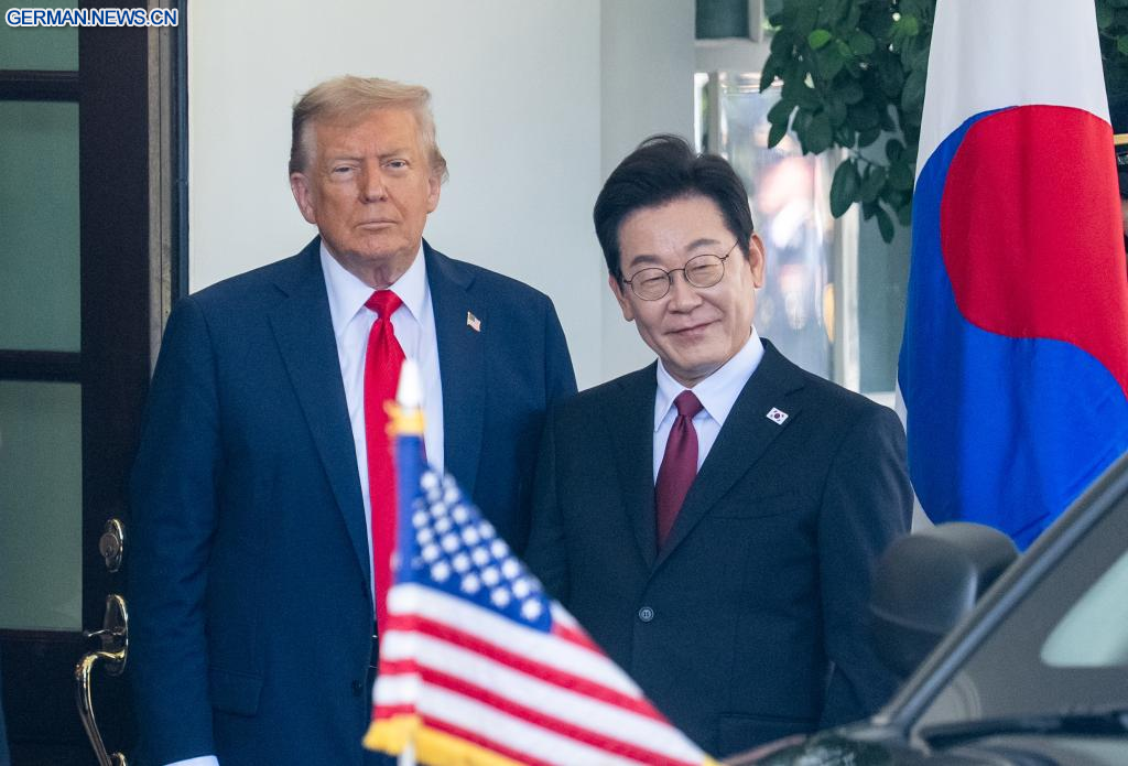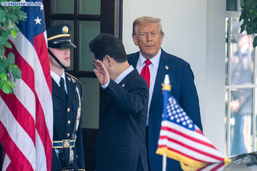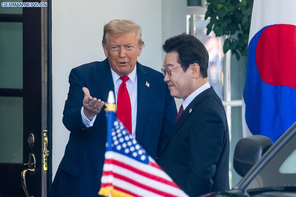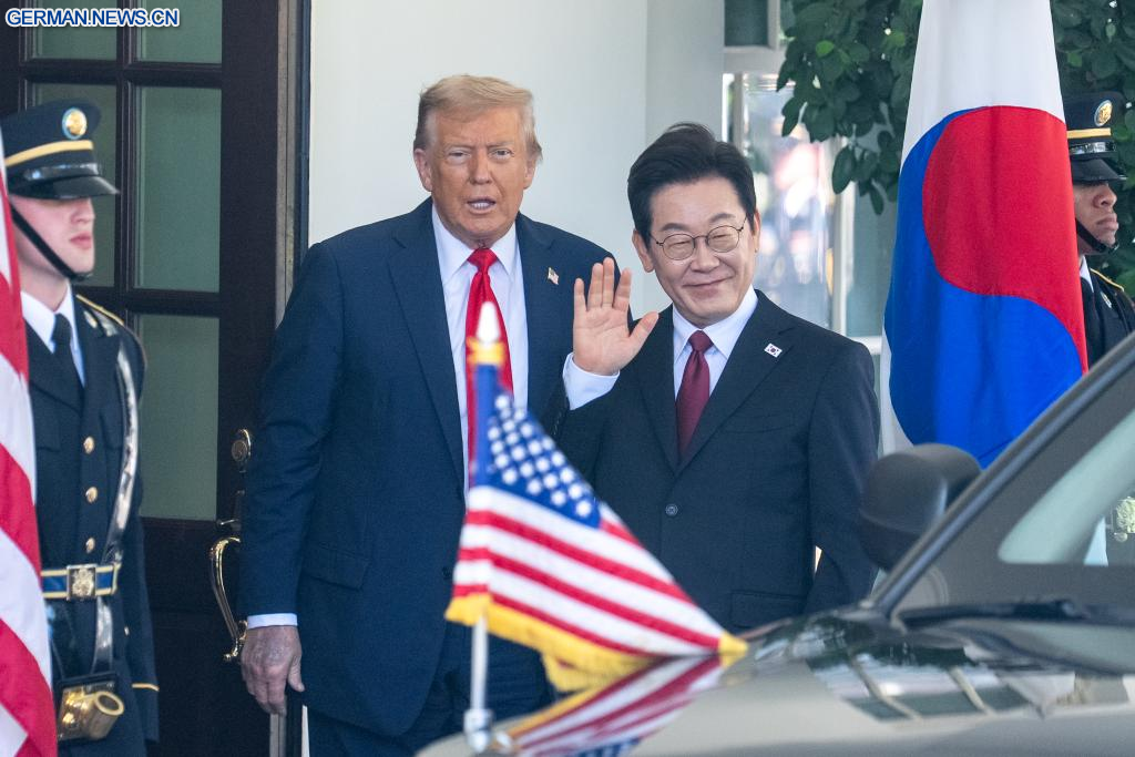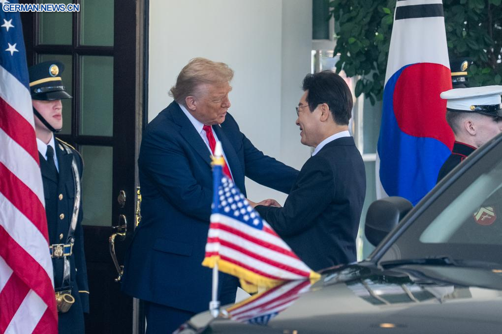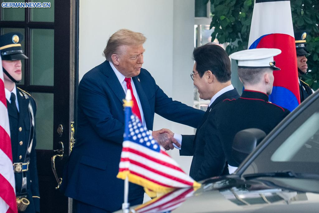 WASHINGTON, 25. August 2025 (Xinhuanet) -- US-Präsident Donald Trump (2. v. l.) empfängt den zu Besuch befindlichen südkoreanischen Präsidenten Lee Jae-myung (2. v. r.) im Weißen Haus in Washington, D.C., den Vereinigten Staaten, 25. August 2025. (Quelle: Xinhua/Hu Yousong)