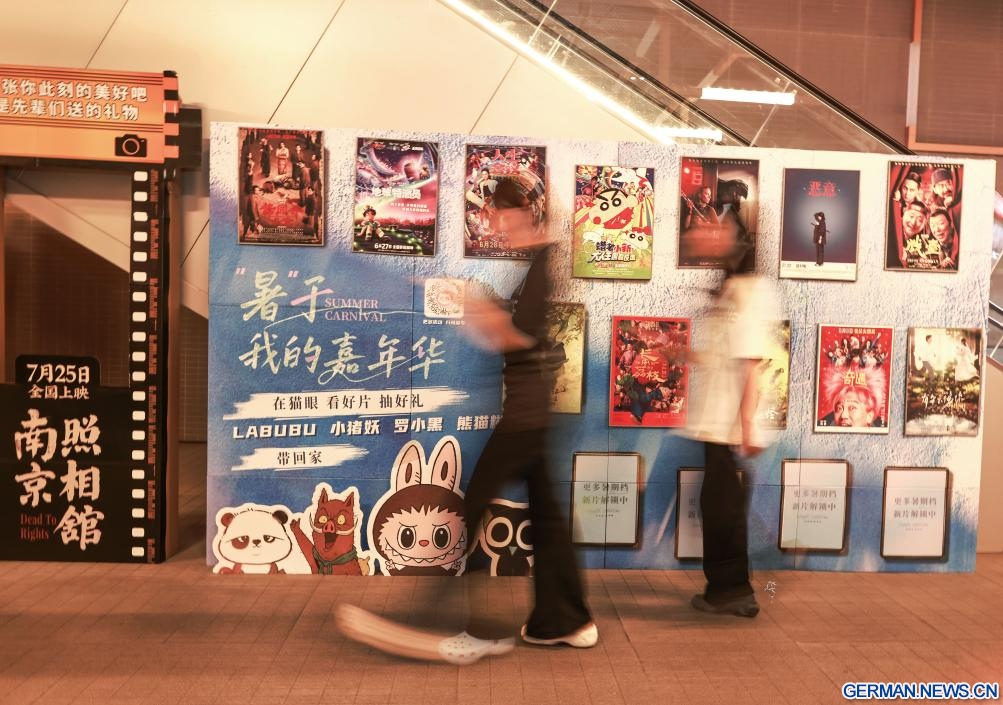 BEIJING, 25. August 2025 (Xinhuanet) -- Zuschauer gehen an Filmplakaten in einem Kino in Wuhan in der zentralchinesischen Provinz Hubei vorbei, 25. August 2025. Chinas Sommer-Kinoeinnahmen haben bis Sonntag 11 Milliarden Yuan (etwa 1,5 Milliarden US-Dollar) überschritten, wobei einheimische Filme die Saison-Topverdiener dominieren. (Foto von Zhao Jun/Xinhua)