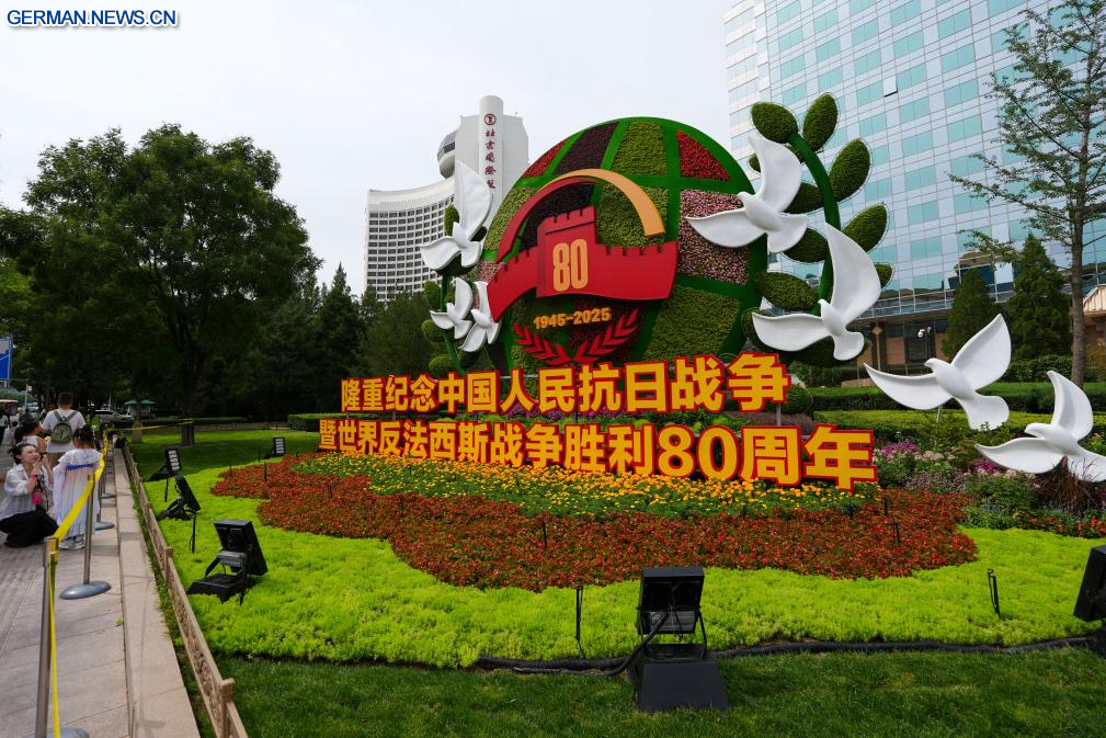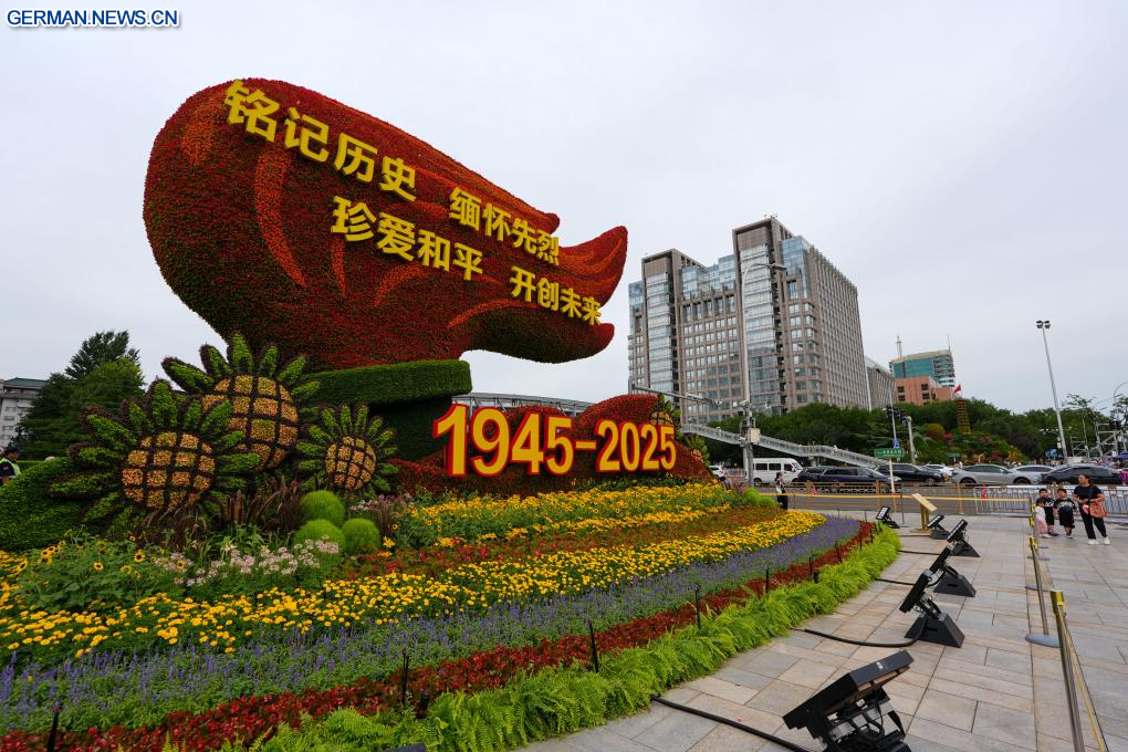 BEIJING, 26. August 2025 (Xinhuanet) -- Eine Reihe von Blumeninstallationen ist in Jianguomen in Chinas Hauptstadt Beijing abgebildet, 26. August 2025. Zehn Blumeninstallationen entlang der Chang'an-Allee zum 80. Jahrestag des Sieges im Widerstandskrieg des chinesischen Volkes gegen die japanische Aggression und im weltweiten antifaschistischen Krieg wurden fertiggestellt. (Quelle: Xinhua/Ju Huanzong)
