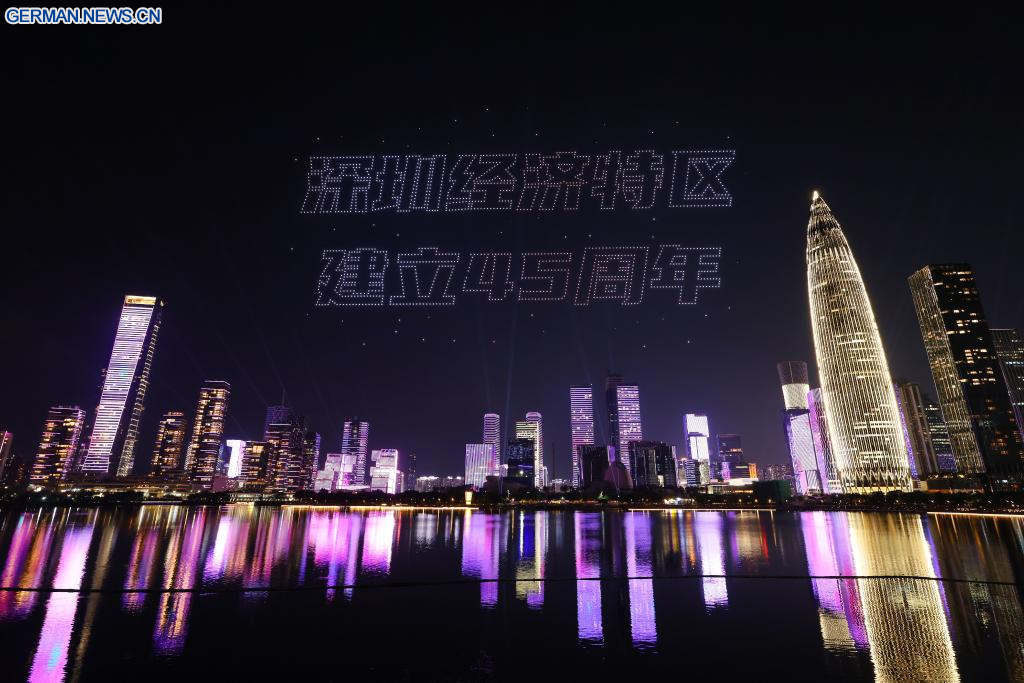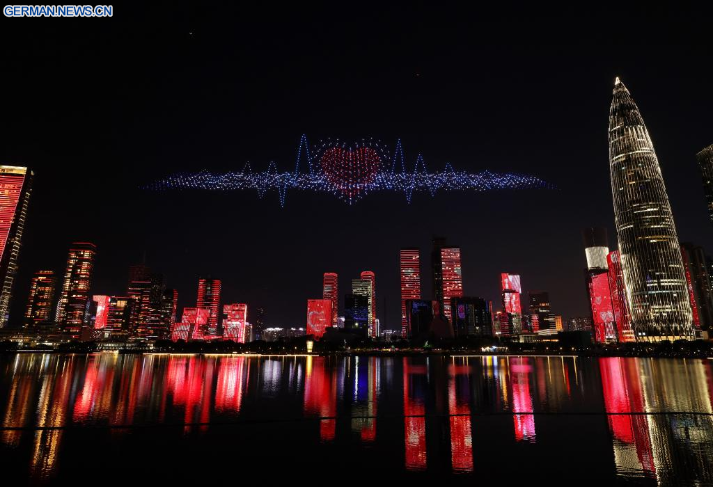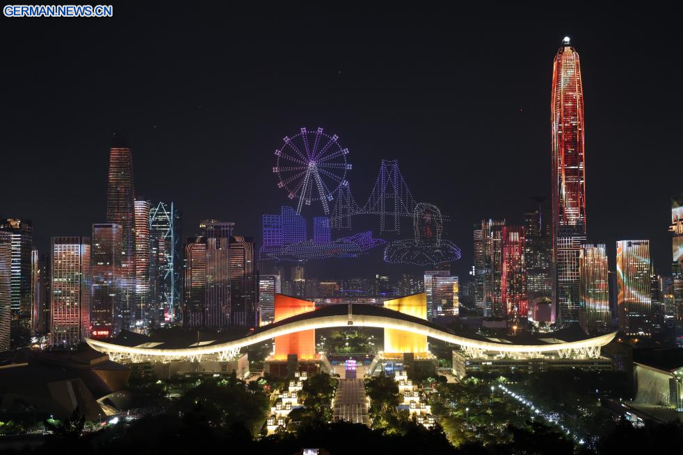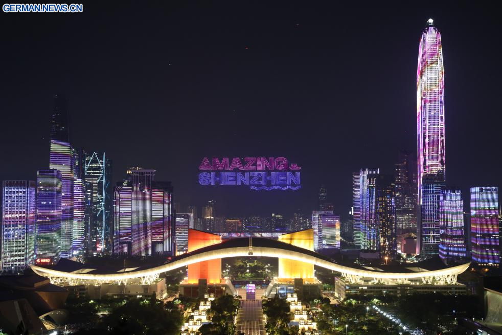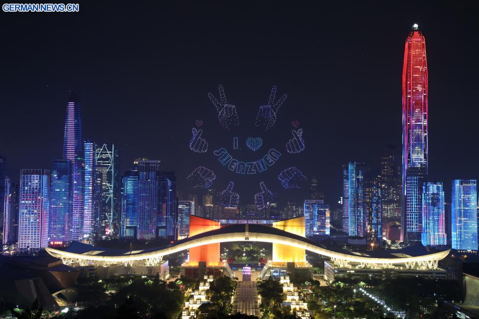 SHENZHEN, 27. August 2025 (Xinhuanet) -- Eine Drohnen-Lichtshow wird anlässlich des 45. Jahrestages der Sonderwirtschaftszone Shenzhen in Shenzhen in der südchinesischen Provinz Guangdong aufgeführt, 26. August 2025. (Quelle: Xinhua/Liang Xu)