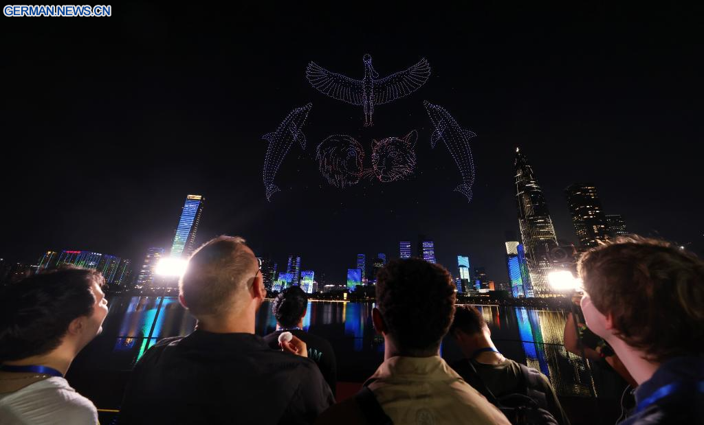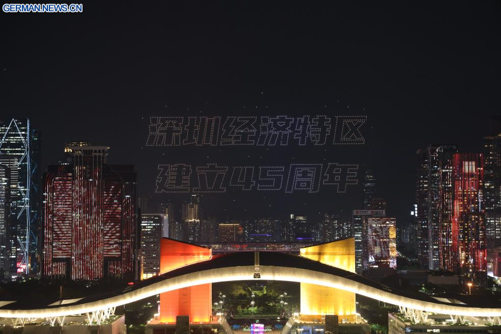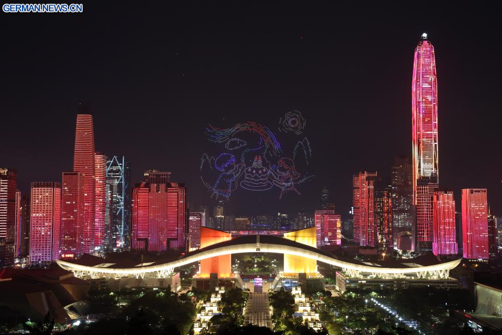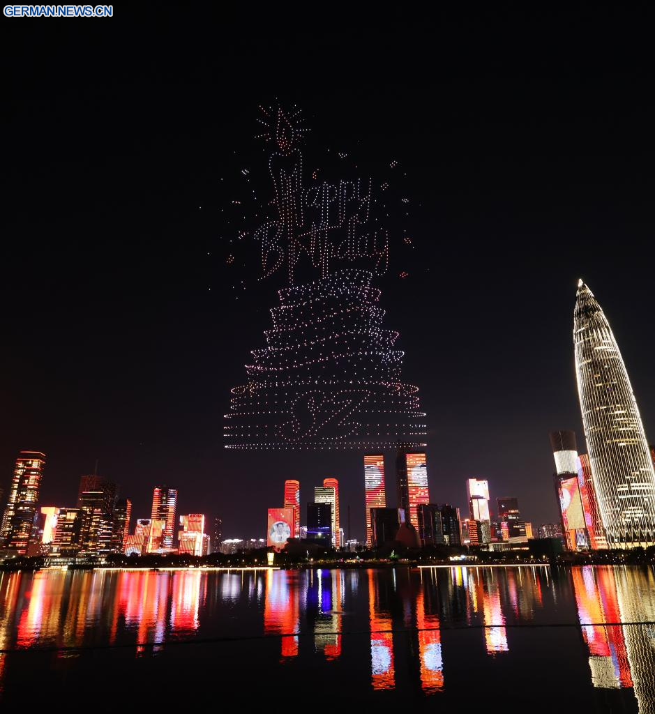 SHENZHEN, 27. August 2025 (Xinhuanet) -- Eine Drohnen-Lichtshow wird anlässlich des 45. Jahrestages der Sonderwirtschaftszone Shenzhen in Shenzhen in der südchinesischen Provinz Guangdong aufgeführt, 26. August 2025. (Quelle: Xinhua/Liang Xu)