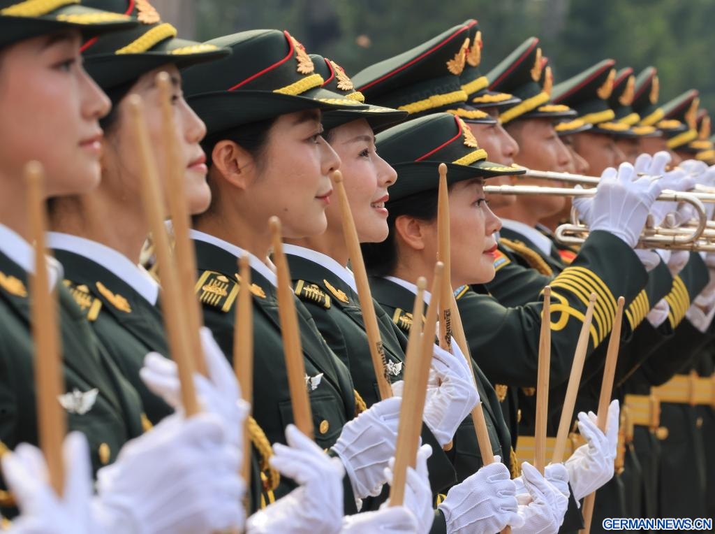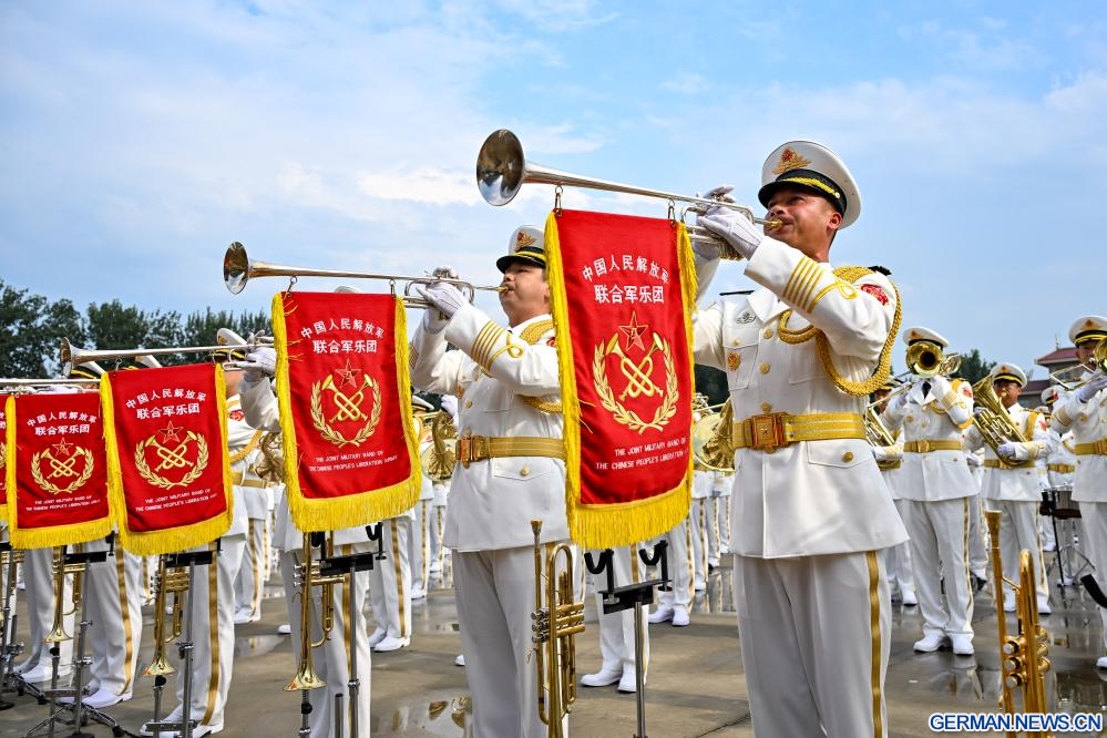 BEIJING, 20. August 2025 (Xinhuanet) -- Mitglieder der gemeinsamen Militärkapelle der chinesischen Volksbefreiungsarmee nehmen an einem Training für die bevorstehende Militärparade zum Tag des Sieges in Chinas Hauptstadt Beijing teil, 12. August 2025. (Quelle: Xinhua/Zhang Cheng)