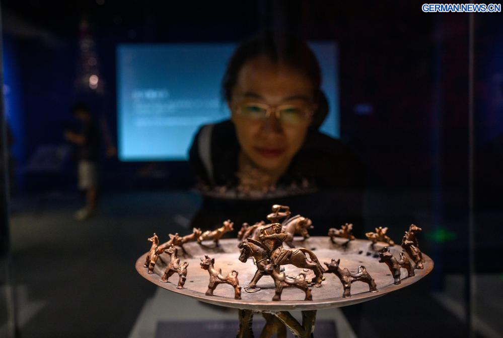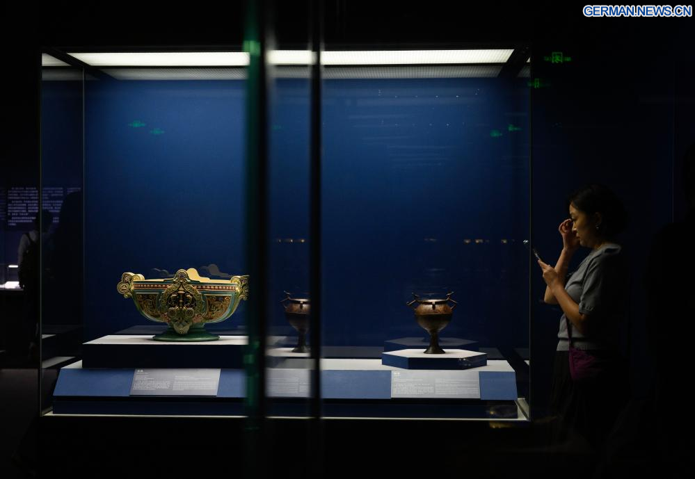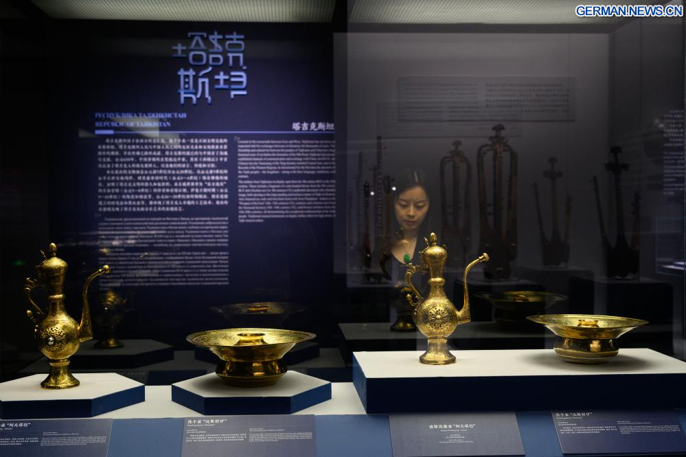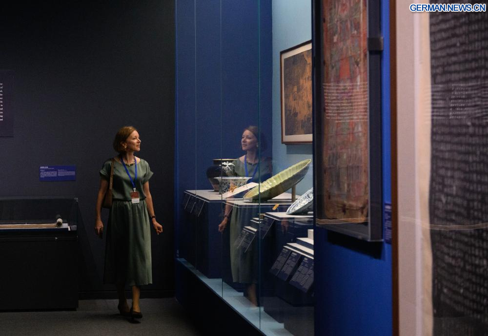 BEIJING, 27. August 2025 (Xinhuanet) -- Eine Frau besucht eine Ausstellung mit dem Thema „Wo Zivilisationen aufeinandertreffen: Sammlungen aus Museen der Mitgliedstaaten der Shanghaier Organisation für Zusammenarbeit“ im Nationalmuseum in der chinesischen Hauptstadt Beijing, 27. August 2025. Die Ausstellung mit 220 Kulturgütern und Artefakten, die aus 10 Kulturinstitutionen der Mitgliedstaaten der Shanghaier Organisation für Zusammenarbeit ausgewählt wurden, wurde am Mittwoch hier eröffnet. (Quelle: Xinhua/Jin Liangkuai)