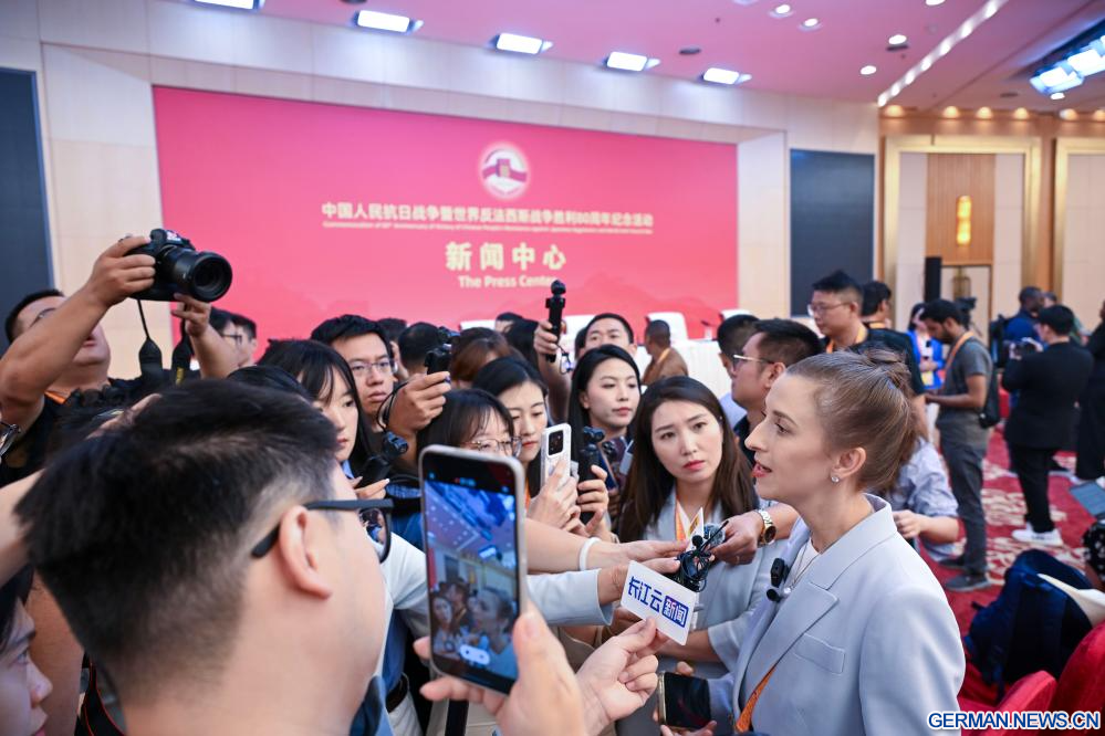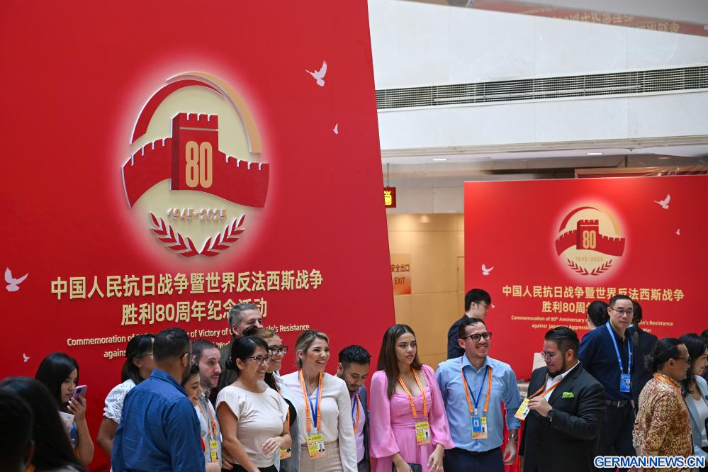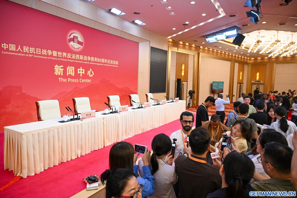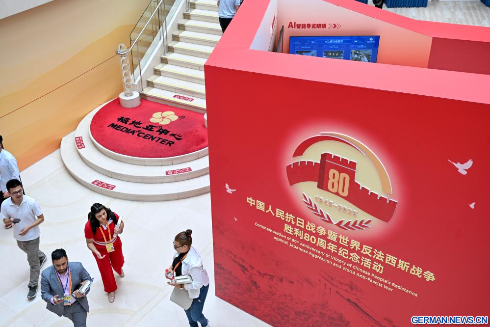 BEIJING, 28. August 2025 (Xinhuanet) -- Journalisten arbeiten im Pressezentrum des Gedenkens an den 80. Jahrestag des Sieges im Widerstandskrieg des chinesischen Volkes gegen die japanische Aggression und im weltweiten antifaschistischen Krieg in Beijing, der Hauptstadt Chinas, 28. August 2025. Das Pressezentrum wurde hier am Mittwoch eröffnet.