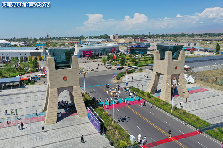BEIJNG, 29. August 2025 (Xinhua) -- Die Luftaufnahme einer Drohne zeigt einen Blick auf das Internationale Grenzkooperationszentrum Horgos an der chinesisch-kasachischen Grenze in Horgos im Uigurischen Autonomen Gebiet Xinjiang im Nordwesten Chinas, 26. Juli 2024. (Xinhua/Ding Lei)
