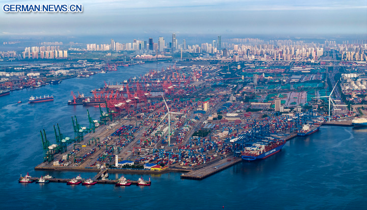 BEIJNG, 29. August 2025 (Xinhua) -- Die Luftaufnahme einer Drohne zeigt einen Blick auf ein Containerterminal des Hafens von Tianjin in Nordchina, 22. August 2025. (Xinhua/Zhao Zishuo)