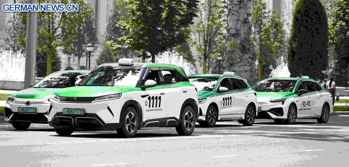 BEIJNG, 29. August 2025 (Xinhua) -- Das Foto zeigt in China hergestellte Fahrzeuge mit neuer Energie (NEV) auf einer Straße in Duschanbe in Tadschikistan, 29. Mai 2025. (Xinhua/Li Renzi)