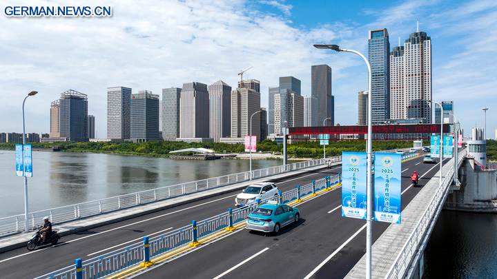 BEIJNG, 29. August 2025 (Xinhua) -- Das Foto zeigt Laternenpfähle mit Hinweisbannern über den bevorstehenden diesjährigen Gipfel der Shanghaier Organisation für Zusammenarbeit (SOZ) in der Binhai New Area in Tianjin in Nordchina, 22. August 2025. (Xinhua/Zhao Zishuo)