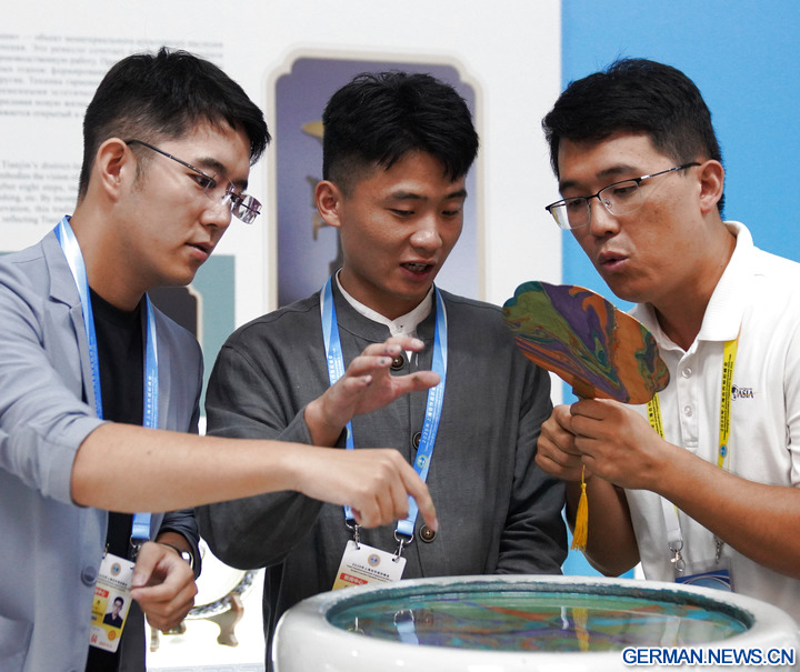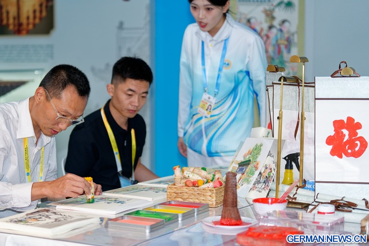 TIANJIN, 1. September 2025 (Xinhua) -- Ein Journalist (rechts) fertigt einen Lackfächer im Pressezentrum des Gipfels der Shanghaier Organisation für Zusammenarbeit (SOZ) 2025 in Tianjin in Nordchina, 31. August 2025. Der SOZ-Gipfel 2025 findet vom 31. August bis zum 1. September in Tianjin statt. Das Pressezentrum des Gipfels bot eine Erlebniszone zum Thema immaterielles Kulturerbe, in der Journalisten die Möglichkeit hatten, sich mit lokalen Handwerkskünsten des immateriellen Kulturerbes wie Neujahrs-Holzschnitten aus Yangliuqing, Zhang-Tonfiguren und der Herstellung von Lackarbeiten vertraut zu machen. (Xinhua/Dai Mingxuan)
