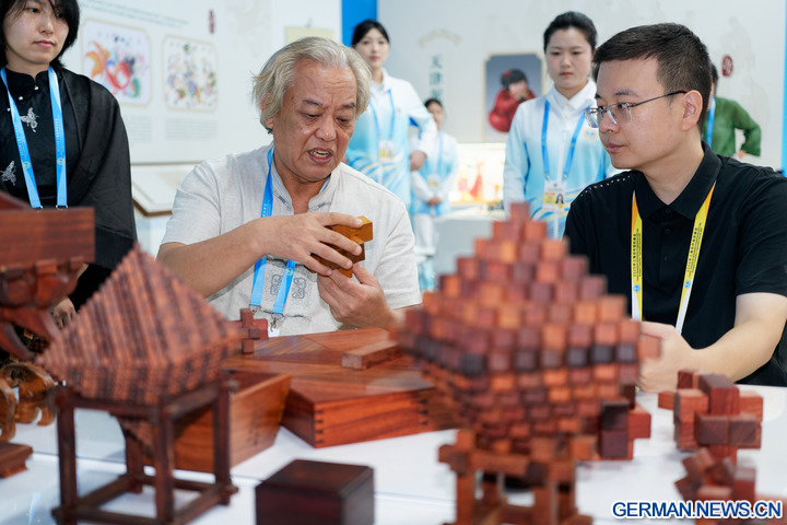TIANJIN, 1. September 2025 (Xinhua) -- Eine indonesische Journalistin (links) erfährt etwas über die Techniken der Zapfen- und Schlitzverbindung im Pressezentrum des Gipfels der Shanghaier Organisation für Zusammenarbeit (SOZ) 2025 in Tianjin in Nordchina, 31. August 2025. Der SOZ-Gipfel 2025 findet vom 31. August bis zum 1. September in Tianjin statt. Das Pressezentrum des Gipfels bot eine Erlebniszone zum Thema immaterielles Kulturerbe, in der Journalisten die Möglichkeit hatten, sich mit lokalen Handwerkskünsten des immateriellen Kulturerbes wie Neujahrs-Holzschnitten aus Yangliuqing, Zhang-Tonfiguren und der Herstellung von Lackarbeiten vertraut zu machen. (Xinhua/Zhang Xiaoyu)