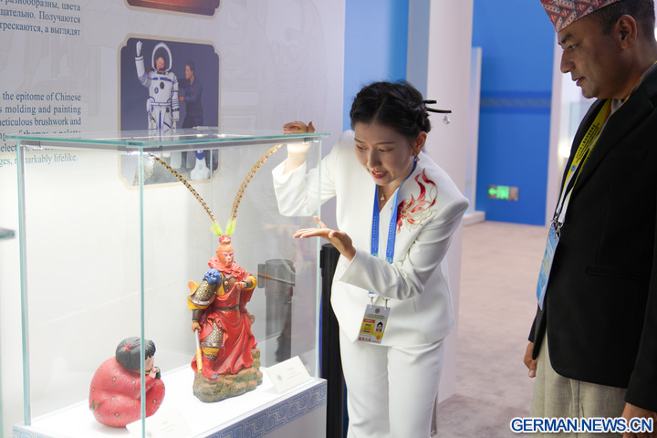 TIANJIN, 1. September 2025 (Xinhua) -- Eine Mitarbeiterin zeigt einem Journalisten die Tonskulpturen-Kunst „Zhang-Tonfiguren“ im Pressezentrum des Gipfels der Shanghaier Organisation für Zusammenarbeit (SOZ) 2025 in Tianjin in Nordchina, 31. August 2025. Der SOZ-Gipfel 2025 findet vom 31. August bis zum 1. September in Tianjin statt. Das Pressezentrum des Gipfels bot eine Erlebniszone zum Thema immaterielles Kulturerbe, in der Journalisten die Möglichkeit hatten, sich mit lokalen Handwerkskünsten des immateriellen Kulturerbes wie Neujahrs-Holzschnitten aus Yangliuqing, Zhang-Tonfiguren und der Herstellung von Lackarbeiten vertraut zu machen. (Xinhua/Dai Mingxuan)
